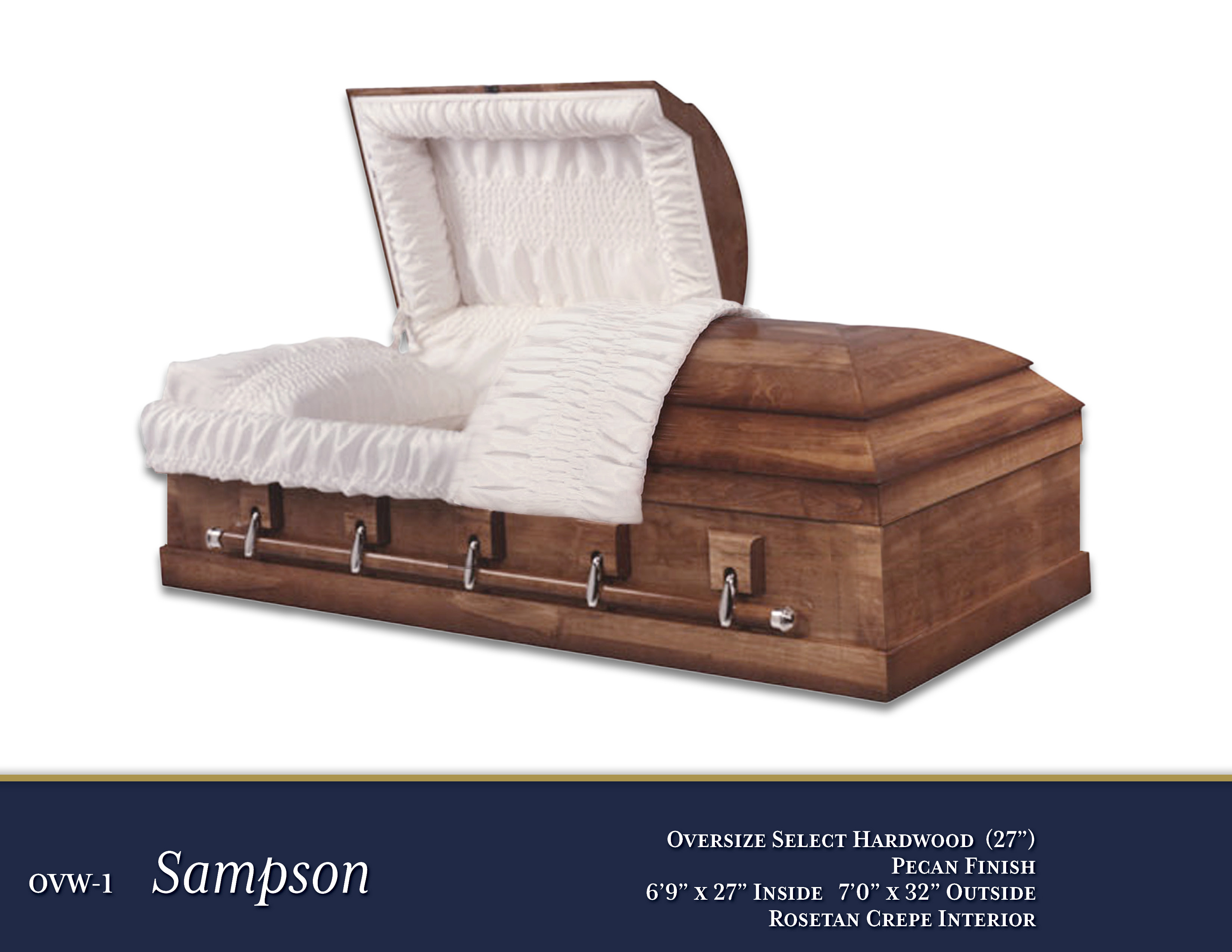 OVW-1 Sampson (27")$4,295.00PriceOversized Select HardwoodPecan Finish6'9" x 27" Inside - 7'0" x 32" OutsideRosetan Crepe InteriorOpen Shareable Image